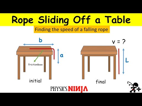 This video illustrates a problem where a portion of a string is hanging over a table and starts to slide and it shows how to calculate which portion has to hang over for it to start sliding and the time it takes for the string to completely come off the table.