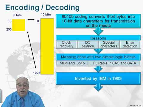 Hello everyone, this is Colin from Fiber Optics For Sale. In this video, I will explain what is 8b/10b encoding. 8b/10b encoding is used by Fiber Optic Gigabit Ethernet. In this coding, each 8 bit data is mapped to a 10 bit data, and then transmitted to the receiving side. Let's see why we need to go through this extra step. If we want to understand the 8b/10b mapping process, we have to understand the problems of directly transmitting baseband data. Here we can see an example of raw baseband digital data. We have a long sequence of 0s. You may also get a long sequence of 1s. They both present the same problem, there is not enough transitions, which means the jumping from 0 to 1, and from 1 to 0. Transitions are very important for the receiver to correctly recover the data clock. Without a correct clock, you will get a very high error rate. Another problem is that the baseband data is not optimized for the transmission medium. The transmission medium may be UTP copper cable or fiber optic cable. So that means we should not directly transmit the baseband data to the line. That is when line codes come to the rescue. What is exactly line code? Line code is developed to solve the problem we just talked about. Line code is basically a digital data coding process. In this process, a line code is chosen for a particular transmission system. This line code is optimized for the physical properties of the medium. A line code will typically reflect technical requirements of the transmission medium, such as optical fiber or twisted pair copper cable. The line code should make it easy to recover the clock from the data, it should have no DC part and small low frequency part and have high transmission efficiency. There are many types of line code used for different purposes. 8b/10b is one commonly used for fiber optic communication systems such as optical gigabit Ethernet. Other line codes include RZ, NRZ, AMI, Manchester Code, and more. Now let's take a closer look at 8b/10b line code. 8b/10b line code is based on 5b/6b and 3b/4b codes. Now let's see how a 8 bit byte is encoded. In the left figure, the hexadecimal word 45 is encoded as a 8 bit byte. 4 is coded as 0100, it occupies position EFGH. 5 is coded as 0101, it occupies position ABCD. The 8 bit byte is then split to a 5 bit ABCDE and a 3 bit FGH group. The positions of these two groups are then switched in the transmission process. ABCDE is moved to the front, and FGH is moved to the back. Then comes the 8b/10b coding process as shown in the right side picture. A i bit joins the 5 bit ABCDE group. And a j bit joins the FGH group. Here we have to understand the concept of Running Disparity. Running disparity means the difference between the number of 1 bits and the number of 0 bits in the data. The value of i bit and j bit is set on the fly depending on the current running disparity. We will see clearly how this works in the next slide. Here is the mapping table of 5b/6b and 3b/4b. In the 5b/6b table, if the raw input data has ABCDE bit of 00000, it is mapped to either 100111 or 011000. Which one is chosen depends on the running disparity. If the previous running disparity is -1, which means there was one less 1 bit than 0 bit, then 100111 is chosen, so in this code it has 2 more 1s than 0s. -1 plus 2 equals 1, so the running disparity becomes +1. If the previous running disparity is +1, which means there is one more 1 bit than 0 bit, then 011000 is chosen, so in this code it has 2 less 1s than 0s. 1 plus minus 2 equals -1, the running disparity becomes -1. In the 3b/4b mapping table, it follows the same procedure. This running disparity process makes sure the difference between the number of 1s and 0s is always between 1 and -1. And the 5b/6b and 3b/4b mapping process makes sure there is frequent transitions from 1 to 0 and from 0 to 1, so the clock can be easily recovered on the receiver side. 8b/10b line coding has many benefits than directly transmitting baseband data. Here is a few listed. 8b/10b coding provides frequent transitions for easy clock recovery on the receiver side. It provides a balance between the number of one bits and zero bits transmitted. This is called DC balance. DC balance makes sure the optical laser is maintained at around 50% duty cycle for best performance and power usage. DC balance puts a limit on the DC offset on the receiver side which helps maintain a good level detect thresholds. So there you have it. Please leave your comment below if you'd like to see other topics. Don't forget to visit for more free fiber optic tutorials. I will see you in the next video!