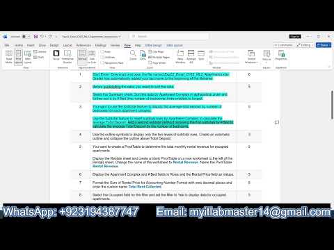 Exp22_Excel_Ch05_ML2_Apartments Contact Me For Your Assignments and Courses : WhatsApp: +923194387747 WhatsApp Link: Email : myitlabmaster14@ We are providing help in all Online Courses, Computer Science, Business and Management, Business Math, Business and Finance, Business and Accounting, Human Resource Management, History, English, Literature, Nursing, psychology, Statistics, Information Technology, Applied Sciences and Many more #Exp22_Excel_Ch05_ML2_Apartments #exp22_excel_ch05_ml2 #Excel_Ch05_ML2_Apartments Exp22_Excel_Ch05_ML2_Apartments | Exp22 Excel Ch05 ML2 Apartments_Mylab_Excel_Ch05 #Exp22_Excel_Ch05_ML2_Apartments#exp22_excel_ch05_ml2 apartments#Excel_Ch05_ML2_Apartments#Ch05_ML2_Apartments #ML2_Apartments#Exp22 Excel Ch05 ML2#Exp22_Excel_Ch05 #Exp22_ML2_Apartments#ML2_Apartments_Ch05 #Exp22_Excel_Ch05_ML2_Apartments#exp22_excel_ch05_ml2 apartments#Excel_Ch05_ML2_Apartments#Ch05_ML2_Apartments #ML2_Apartments#Exp22 Excel Ch05 ML2 Exp22_Excel_Ch05_ML2_Apartments Project Description: You manage several apartment complexes in Phoenix, Arizona. You created a dataset that lists details for each apartment complex, such as apartment number, including number of bedrooms, whether the unit is rented or vacant, the last remodel date, rent, and deposits. You will use the datasets to aggregate data to analyze the apartments at the complexes. 1 Start Excel. Download and open the file named . Grader has automatically added your last name to the beginning of the filename. 2 Before subtotalling the data, you need to sort the data. Select the Summary sheet. Sort the data by Apartment Complex in alphabetical order and further sort it by # Bed (the number of bedrooms) from smallest to largest. 3 You want to use the Subtotal feature to display the average total deposit by number of bedrooms for each apartment complex. Use the Subtotal feature to insert subtotal rows by Apartment Complex to calculate the average Total Deposit. Add a second subtotal (without removing the first subtotal) by # Bed to calculate the average Total Deposit by the number of bedrooms. 4 Use the outline symbols to display only the two levels of subtotal rows. Create an automatic outline and collapse the outline above Total Deposit. 5 You want to create a PivotTable to determine the total monthly rental revenue for occupied apartments. Display the Rentals sheet and create a blank PivotTable on a new worksheet to the left of the Rentals sheet. Change the name of the worksheet to Rental Revenue. Name the PivotTable Rental Revenue. 6 Display the Apartment Complex and # Bed fields in Rows and the Rental Price field as Values. 7 Format the Sum of Rental Price for Accounting Number Format with zero decimal places and enter the custom name Total Rent Collected. 8 Select the Occupied field for the filter and set the filter to Yes to display data for occupied apartments. 9 You want to calculate the total monthly rental revenue if the rates increase by 5% for the occupied apartments. Insert a calculated field to multiply the Rental Price by . Change the name to New Rental Revenue. Apply Accounting Number Format with zero decimal places. 10 Select the range B3:C3 and apply these formats: wrap text, Align Right horizontal alignment, 30 row height, and 15 column width. 11 Apply Light Orange, Pivot Style Medium 10 to the PivotTable and display banded rows. 12 Insert a slicer for # Bed so that you can filter the dataset by number of bedrooms. Change the slicer caption to # of Bedrooms. 13 Change the slicer height to 1.4 inches and width to inches. Apply Light Orange, Slicer Style Light 2. Cut the slicer and paste it in cell E2. 14 Insert a timeline for the Last Remodel field. Change the time period to YEARS. Apply Light Orange, Timeline Style Light 2. Change the timeline height to 1.4 inches and with to inches. 15 The Databases sheet contains two tables. You will create a relationship between those tables. Display the Databases sheet. Create a relationship between the APARTMENTS table using the Code field and the COMPLEX table using the Code field. 16 You want to create a PivotTable from the related tables. Create a PivotTable using the data model on a new sheet. Change the sheet name to Bedrooms. 17 Select the Apartment Name field from the COMPLEX table for Rows, the # Bed field for Columns, and the # Bed field as Values. This will display the number of apartments with the specified number of bedrooms per apartment complex. Display the values as a percentage of row totals. 18 Create a Clustered Column PivotChart. Cut the chart and paste it in cell A13. 19 Select the 3-bedroom data series and apply the Black, Text 1, Lighter 50% solid fill color. Apply Black, Text 1 font color to the vertical axis. Change the chart height to 3.4 inches and the width to 5.2 inches. Hide the field buttons in the PivotChart.