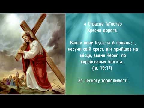 АКТ ЖАЛЮ О мій Боже, зі щирого серця жалію, що образив Тебе своїми гріхами (назвати гріхи ...) Я дуже Тебе люблю і завжди хочу бути з Тобою. Допоможи мені позбутися усього, що перешкоджає чути Твій голос і єднатися з Тобою. Боже, будь милостивий до мене, грішного, бо всім серцем прагну виправитись і укріпити свою віру. Серце чисте утвори в мені, Боже, і даруй мені Твого Святого Духа. Амінь! 1.ПЕРШЕ СТРАСНЕ ТАЇНСТВО СТРАЖДАННЯ В ОЛИВНОМУ САДУ Повний скорботи та тривоги, він ще ревніше молився, а піт його став, мов каплі крови, що падали на землю. Підвівшись від молитви, він підійшов до учнів і застав їх сплячими від смутку. (Луки 22:44-45) Маріє, заступайся за нас, щоб і ми навчилися у всьому приймати волю Отця. Бо тільки так здійснюється спасіння світу і наше власне спасіння. 2.ДРУГЕ СТРАСНЕ ТАЇНСТВО БИЧУВАННЯ ІСУСА ХРИСТА Взяв тоді Пилат Ісуса і велів його бичувати. (Івана 19:1) Він же був поранений за гріхи наші, роздавлений за беззаконня наші. Кара, що нас спасає, була на ньому, і його ранами ми вилікувані. (Ісая 53:5) Страждаючий Ісусе і Маріє, яка страждала разом з Ним, прости мене, що іноді я безпідставно погоджуюсь коли осуджують мого ближнього. Прости за моє Пилатове вмивання рук. 3.ТРЕТЄ СТРАСНЕ ТАЇНСТВО ТЕРНЯМ УВІНЧАННЯ Вояки, сплівши вінок із тернини, поклали йому на голову і одягли його у багряницю; і, підступаючи до нього, казали: "Радуйся, царю юдейський і били його по лиці." (Івана 19:1-3) Маріє, допоможи нам зрозуміти і відчути в наших серцях, що Ісус – і тільки Він – несе світові правду і надію на Вічне Життя. 4.ЧЕТВЕРТЕ СТРАСНЕ ТАЇНСТВО ІСУС НЕСЕ ХРЕСТ Взяли вони Ісуса та й повели; і, несучи свій хрест, він вийшов на місце, зване Череп, по єврейському Голгота. (Івана 19:17) Маріє, будь при мені, коли я зіткнуся з викликом Симона Киринейського та Вероніки, щоб хоч трохи полегшити страждання свого ближнього. Бо саме це означають слова Ісуса: «Нехай іде за Мною». 5.П'ЯТЕ СТРАСНЕ ТАЇНСТВО РОЗП'ЯТТЯ ІСУСА ХРИСТА Було вже близько шостої години, і темрява по всій землі настала аж до дев'ятої години... Ісус закликав сильним голосом: "Отче, у твої руки віддаю дух мій!" Сказавши це, він віддав духа. (Луки 23:44-46) Маріє, заступайся за мене, щоб Страждання Ісуса навчили мене прощати і любити. Будь зі мною в останню годину, щоб я віддав свій дух Небесному Отцю в тіні Ісусового хреста, і міг почути слова надії: «Ти будеш зі Мною в раю». ТАЙМІНГ: 00:00 - Акт жалю 04:30 - Перше Страсне Таїнство - Страждання в Оливному саду 08:29 - Друге Страсне Таїнство - Бичування Ісуса Христа 12:28 - Третє Страсне Таїнство - Коронування терновим вінком 16:23 - Четверте Страсне Таїнство - Ісус несе хрест 21:06 - П’яте Страсне Таїнство - Розп’яття Ісуса Христа