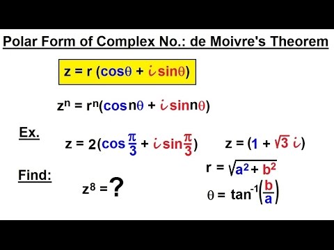 Thanks to all of you who support me on Patreon. You da real mvps! $1 per month helps!! :) !! DeMoivre's Theorem: Raising a Complex Number to a Power, Ex 1. In this video I give DeMoivre's theorem and use it to raise a complex number to a power. Note that our number must be in polar form!