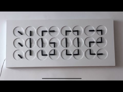 A digital clock that uses sliding frames to conceal certain segments of the digits. Every minute, the frames move in a synchronized manner to display the current time. The clock is powered by a microprocessor that controls eight small stepper motors. A battery-backed real-time clock (RTC) module keeps track of the time. (And no, it's not nearly as loud in reality. I failed to adjust the sound level when I tried to use noise reduction to eliminate the background noise from the recording.) Build one yourself: