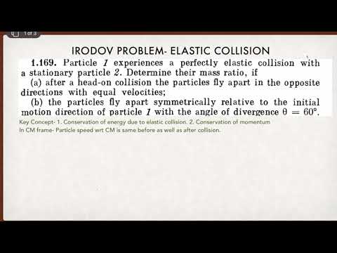 In this video, we are discussing Irodov problem- . we will learn how we can solve collision problem easily in CM frame. in CM frame Kinetic enegry wiil be= 0.5(m1u1c)^2+ 0.5(m2u2c)^2+ 0.5(m1 +M2)Vc)^2. beacuse the third term is const so change in K.E is same as in Lab frame.