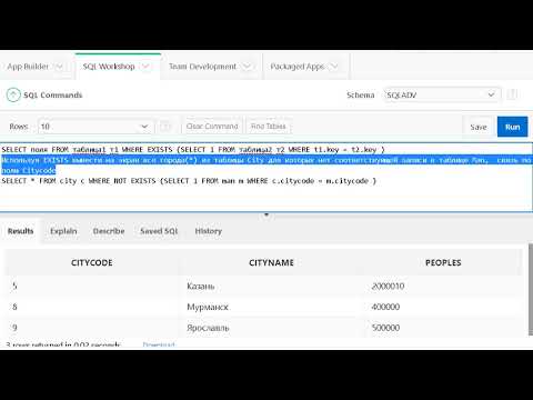 Oracle SQL. Предикат ANY является верным , если из всех значений выведенные подзапросом если любой из их удовлетворяет условию для текущей строки внешнего запроса. Предикат ALL является верным, если каждое значение выбранное подзапросом удовлетворяет условию в предикате внешнего запроса. -- учебная среда схема: SQLADV польз: student1 пароль: student1 будут работать (student2/ student2, student3/ student3 .... student11/ student11) меню SQL Workshop , SQL Command или используйте скрипт бд для загрузки в sqlfiddle урок и задания