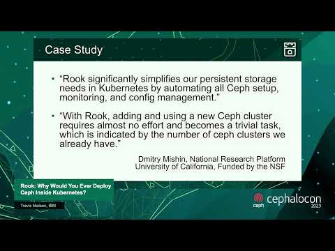 Deploy Ceph in Kubernetes: Rook Deep Dive - Travis Nielsen & Subham Rai, IBM Do you run Kubernetes? Rook is the answer to natively integrate Ceph with Kubernetes, with K8s workloads running in production for over six years. Rook configures Ceph to provide stable block (RWO), shared file system (RWX), and object storage (S3). We will give an overview of Rook as well as deep dive into the core configuration features including encryption, recent feature additions, and future plans for the project. Rook was accepted as a graduated project by the Cloud Native Computing Foundation in October 2020.