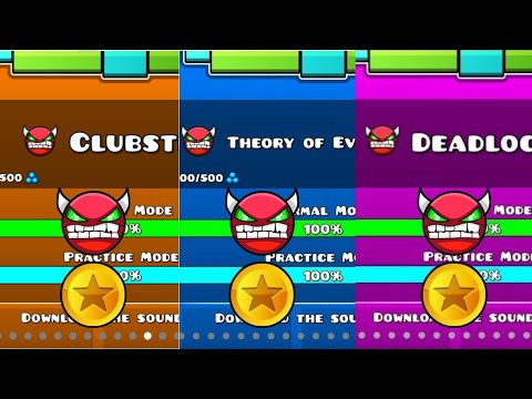 100% 3 coins clubstep, toe 2, y deadlocked , LOS 3 DEMONS 5…