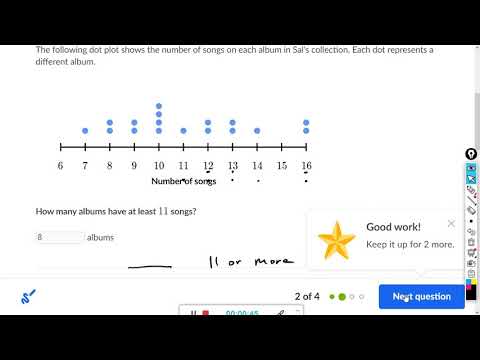 Courses on Khan Academy are always 100% free. Start practicing—and saving your progress—now: In this video, we organize data into frequency tables and dot plots (sometimes called line plots). Practice this lesson yourself on right now: Watch the next lesson: Missed the previous lesson? Grade 6th on Khan Academy: By the 6th grade, you're becoming a sophisticated mathemagician. You'll be able to add, subtract, multiply, and divide any non-negative numbers (including decimals and fractions) that any grumpy ogre throws at you. Mind-blowing ideas like exponents (you saw these briefly in the 5th grade), ratios, percents, negative numbers, and variable expressions will start being in your comfort zone. Most importantly, the algebraic side of mathematics is a whole new kind of fun! And if that is not enough, we are going to continue with our understanding of ideas like the coordinate plane (from 5th grade) and area while beginning to derive meaning from data! (Content was selected for this grade level based on a typical curriculum in the United States.) About Khan Academy: Khan Academy offers practice exercises, instructional videos, and a personalized learning dashboard that empower learners to study at their own pace in and outside of the classroom. We tackle math, science, computer programming, history, art history, economics, and more. Our math missions guide learners from kindergarten to calculus using state-of-the-art, adaptive technology that identifies strengths and learning gaps. We've also partnered with institutions like NASA, The Museum of Modern Art, The California Academy of Sciences, and MIT to offer specialized content. For free. For everyone. Forever. #YouCanLearnAnything Subscribe to Khan Academy à ªs 6th grade channel: Subscribe to Khan Academy: