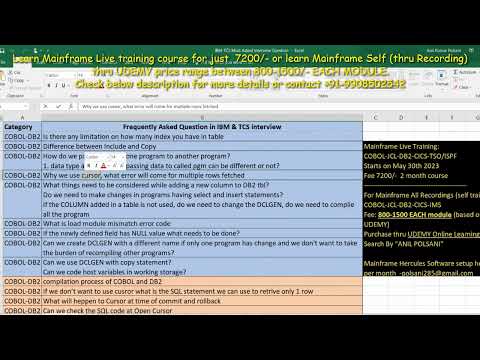 We offer flexible learning options through online live sessions and recorded videos, based on your convenience. You can enroll in one or multiple modules, choosing either live training or recorded content. Recorded videos are available immediately, with more content added regularly, allowing you to start or continue learning at any time. A few videos have already been uploaded. Please reach out to us for access to continuation videos on JCL, VSAM, COBOL, DB2, CICS, REXX, IMS DB, and Assembler. Contact us: 📞 +91-7997745085 (WhatsApp) 📧 mftrngrequest@ 🌐 Refer to our website for the complete list of topics: Please share the questions you encountered during your interviews with us. I'm gathering interview questions to refresh our interview question videos. Once I receive the questions, we'll produce videos with answers to update our content.