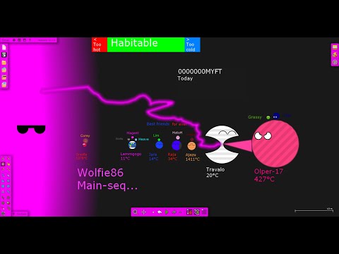 If you want to watch it or spread it on Scratch: Profile: Project: Music used (in order): To Pass Time - Godmode Nebular Focus - Dan Henig Sunrise in Paris - Dan Henig Sunspots - Jeremy Blake Fortress Europe - Dan Bodan Moons' names: - Grasfla: Corey - Lemmgogo: Magent(Magenta colored), Wolfa(Wolf looking), Heave(Skiish colored) - Jara: Lim - Raja: Hotoh - Ajazu: Hella - Travalo: [none] - Olper-17: Nav(Navy colored); Grassy(Greenish colored) - Mars 2.0: Pypae - Lazuli: Lapis - Dandelionna: Redy(Red colored) Burna(Hot-Magenta colored) Turquois(Turquoise colored) Cya(Cyan colored) - Blu: [none] - Dedsa-69: [none] - Coloria: [none] - Blancia: [none] Timestamps: 0:00 Intro 0:21 !Health Warning! 0:26 Formation of planets 1:08 Complete death of Virstro, Birth of a new. 1:34 Wolfie86 enters main sequence 1:57 Lunar period 2:41 Aquatic period, then life appears 3:23 Thermal anomaly 3:52 Modern-ish eon 4:15 New comers 4:23 Modern times 5:16 Missions out! 5:33 Death by Ω Hypernova 6:01 Recovery 6:26 Lemmgogoians back into business 7:03 Terraforming & Powerful era 8:24 Beginning of heated changes 8:47 Start of global instability 9:07 Nekrozoic era approach the inner system bodies 9:22 Hydrogen becomes low 9:49 True death stage 10:14 Death of the new host 10:26 Frictions and slips of harm 10:57 Loneliness 11:09 Outro