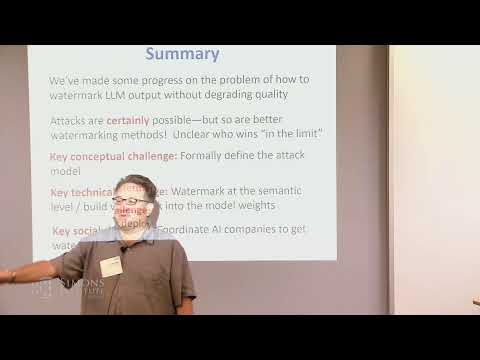 A Google TechTalk, presented by John Thickstun, 2024-07-02 A Google Algorithms Seminar. ABSTRACT: We describe a protocol for planting a watermark into text generated by an autoregressive language model (LM) that is robust to edits and does not change the distribution of generated text. We generate watermarked text by controlling the source of randomness--using a secret watermark key--that the LM decoder uses to convert probabilities of text into samples. To detect the watermark, any party who knows the key can test for statistical correlations between a snippet of text and the watermark key; meanwhile, our watermark is provably undetectable by anyone who does not know the watermark key. We instantiate our watermarking protocol with two alternative decoders: inverse transform sampling and Gumbel argmax sampling. We apply these watermarks to the , LLaMA 7B, and instruction-tuned Alpaca 7B LMs to experimentally validate their statistical power and robustness to various paraphrasing attacks. ArXiv: ABOUT THE SPEAKER: John Thickstun is a postdoctoral researcher at Stanford University, working with Percy Liang. Previously, he completed a PhD at the University of Washington, advised by Sham M. Kakade and Zaid Harchaoui. His current research focus is to improve the capabilities and controllability of generative models. His work has been featured in media outlets including TechCrunch and the Times of London, recognized by outstanding-paper awards at NeurIPS and ACL, and supported by an NSF Graduate Fellowship and a Qualcomm Innovation Fellowship.