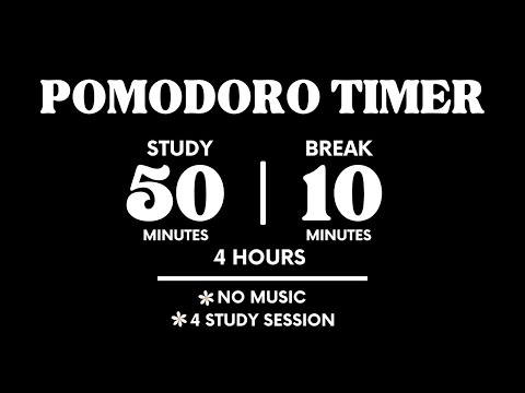 Hi, Study with me. 50 MINUTES STUDY & 10 MINUTES BREAK FOR 4 Hours with NO MUSIC just deep study. I HOPE YOU SUPPORT MY LITTLE WORK BY SUBSCRIBING 😊🥰 Enjoy and wishing you a productive study.🥰 TIMESTAMPS 00:00 - Intro 00:11 - Study Session #1 50:14 - Break Time #1 1:00:17 - Study Session #2 1:50:20 - Break Time #2 2:00:24 - Study Session #3 2:50:26 - Break Time #3 3:00:30 - Study Session #4 3:50:33 - Break Time #4 4:00:39 - END #pomodoro #timer #studytimer #pomodorotimer #studymotivation #5010pomodorotimer #Study #motivation #adhd #focus #studytimer #nomusicpomodoro #pomodoro5010 #pomodoro4hours #pomodorostudywithme #studywithme #studymotivation #studyingvideo #studyvideo #pomodorostudy #pomodorostudysimple #pomodorotimersimple #pomodorotimerminimalist #minimaliststudytimer #palettecolorstudytimer #aestheticstudytimer #aestheticpomodorotimer #4hourspomodorotimer #4hoursstudytimer