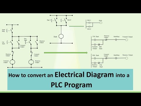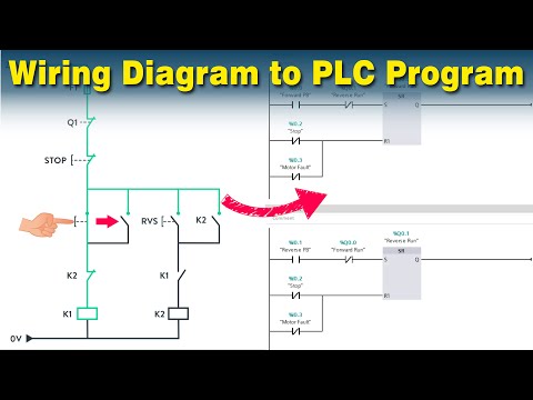 ▶ Want to learn industrial automation? Go here: ▶ Want to train your team in industrial automation? Go here: ▶ Check out the full blog post over at ============================= In this video, you will learn how to convert a basic wiring diagram to a ladder logic PLC program. This can be a very handy skill to learn, especially if you are converting a machine to PLC control. Upgrading a machine to PLC control may seem like a daunting task. However, if you take your time and learn the basics, it can be an easily achievable task. I will walk you through programming a very basic “stop-start” circuit for an electric motor. This should help you get a handle on some of the basics. First, let’s look at our basic start and stop diagram. I like to start on the left and follow the line. Each line represents a wire that is connected. L1 is our 120v hot wire. It will run straight to the normally closed Stop button labeled PB1. From the other terminal on PB1, it runs to a normally open PB2 which is our Start button. From the other terminal on PB2, a wire connects to the A1 terminal on the Motor Starter Coil. The A2 terminal runs to the normally closed overload auxiliary contact. The next wire runs from the other overload terminal to neutral. The next line down shows how a motor starter stays energized. One wire needs to be connected to the input terminal of the start push button. It will run to one terminal of the auxiliary contact set on the motor starter. This ensures power is on the auxiliary contact. The second terminal of the auxiliary contact is connected to the output side of the start push button. When the start button is pushed, the circuit is complete and the motor starter will energize. This closes the auxiliary contact and allows the operator to release the start button. The motor starter will now stay energized until the stop button is pressed and the circuit opens. Programming software is all different but similar. Most have a toolbox somewhere that you will drag your contacts and coils from. Just like on the diagram, we start with the stop pushbutton. It will be represented with an examine OFF bit. These look like a normally closed contact. Drag it to the first ladder rung and the program will place it to the far left. This will be a stop push button. Next, drag an examine ON bit and drop it to the right of the first bit. This looks like normally open contact and will be the start push button. And continue to complete your PLC programming logic according to this simple start-stop wiring diagram. To wrap it up, to program a simple motor start-stop circuit, we need to read the electrical diagram from left to right and open our toolbox on the programming software. You will be using the most common bits in the examine ON, examine OFF, and output coil or output energize. Again, the language is sometimes different between manufacturers, but the symbols pretty well look the same. The bits will represent normally open and normally closed inputs, and a single output. You will also need to use a branch around one bit. This is basically a parallel circuit and OR logic. The start push button OR the auxiliary contact will energize the circuit. I hope this video has been helpful in the transition from wiring diagrams to plc programming. This was a very basic program that can run a motor. ============================= Missed our most recent videos? Watch them here: ============================= To stay up to date with our last videos and more lessons, make sure to subscribe to this YouTube channel: ============================= TWEET THIS VIDEO ============================= Like us on Facebook: Follow us on Twitter: Follow us on LinkedIn #RealPars #ElectricalWiringDiagram #PLC
