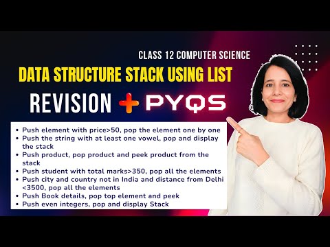 Welcome to playlist: Boards 2025 | Class 12 Computer Science | Revision Series Here is the discussion Data Structure STACK using List | REVISION + Questions for the upcoming board exams 2025. IMPORTANT QUESTIONS Videos: 👉Python: 52 Questions | Python Revision Tour I: 64 Questions | Python Revision Tour II: 30 Questions | Working with Functions: 12 Questions | random Module: 33 MCQs | File Handling: 10 Programs on Text File: 12 PROGRAMS on CSV File and BINARY File Questions | EXCEPTION HANDLING: 5 Programs on Data Structure – Stack: 👉MySQL: 42 Questions | MySQL: 11 Questions | Interface Python with MySQL: Complete Playlists: